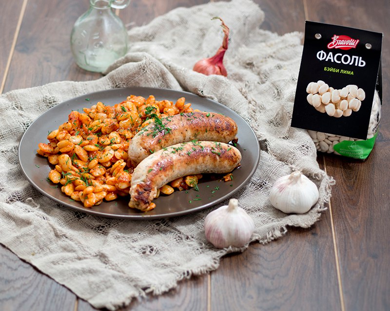 o Подавать, фасоль с колбасками и посыпав мелко нарезанным укропом.