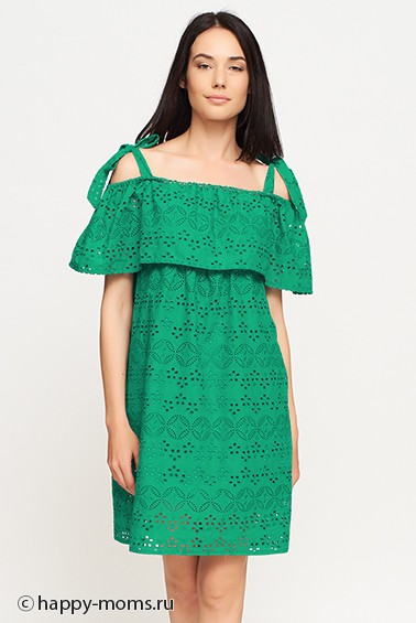 Летний сарафан для беременных на бретелях из прошвы зеленого цвета, длина до колена, свободный силуэт, секрет кормления выполнен в виде прорезов на груди, которые прикрыты верхним слоем ткани, объём на животик создаётся за счёт свободного кроя изделия в области талии .В летний зной так хочется укрыться от жары и почувствовать легкость и непринужденность. В жаркие дни лучше выбирать одежду из натуральных и дышащих тканей, тех, в которых Ваша кожа будет ощущать себя максимально комфортно и легко. Одежда из хлопковой прошвы смотрится очень мило, кокетливо, романтично и элегантно. В такой одежде точно не будет жарко, да и вышивка делает обычную хлопчатобумажную ткань очень привлекательной на вид. Прекрасно смотрится как во время беременности, так и после рождения малыша.