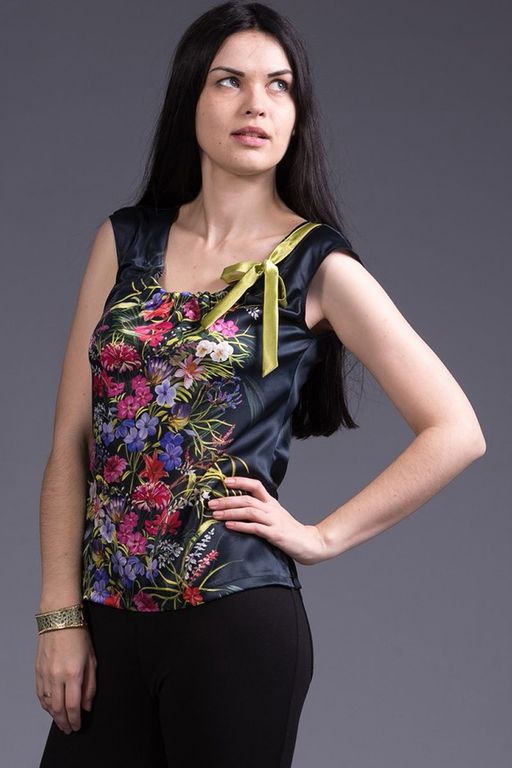Очаровательная блуза прилегающего силуэта, без рукавов из шелковой ткани. На полочке, по линии горловины заложены симметричные складки , создающие объем в области груди. Также, для удобства женщин, по всей длине горловины полочки, обработана кулиска , в которую вдета атласная лента, позволяющая варьировать глубину декольте. По боковым швам, имеются разрезы. Для модели, предлагаются высококачественные натуральные ткани удивительно красивого растительного орнамента В такой блузе, вы будете неотразимы на прогулке, в отпуске. Лаконичный крой изделия, позволит придать вашему образу утонченность, легкость и элегантность