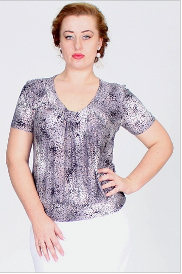 Блуза женская свободного покроя, с короткими рукавами из трикотажного полотна. Рукава короткие, классического кроя. Горловина имеет конусообразную форму, обработана планкой. По низу горловины, небольшая сборка полочки, что обеспечит женщине чувство комфорта. Низ блузы на поясе, что завершает дизайнерское решение художника.