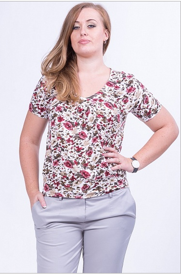 Блуза женская свободного покроя, с короткими рукавами из трикотажного полотна. Рукава короткие, классического кроя. Горловина имеет конусообразную форму, обработана планкой. По низу горловины, небольшая сборка полочки, что обеспечит женщине чувство комфорта. Низ блузы на поясе, что завершает дизайнерское решение художника.