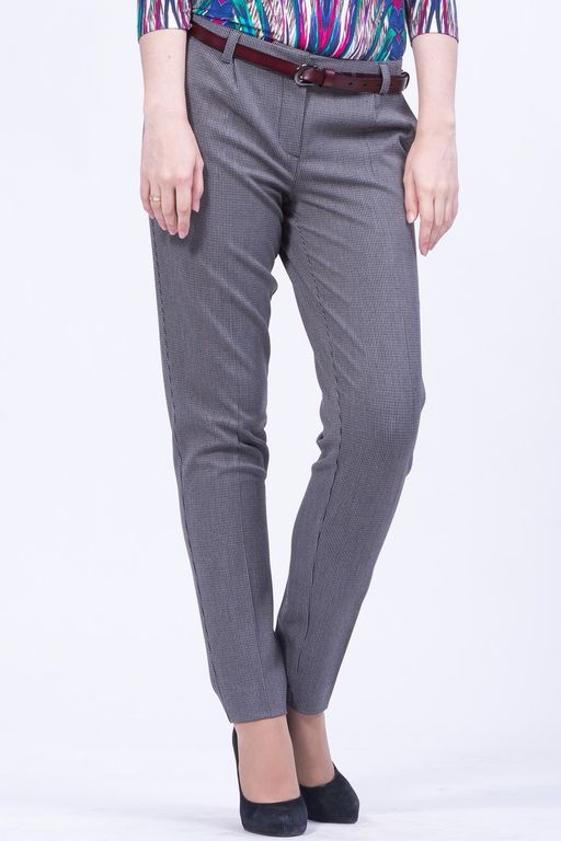 Брюки прилегающего силуэта. Передние части брюк с боковыми карманами с отрезным бочком, с гульфиком. Застежка на молнию и крючок. Задние части с двумя вытачками. Верх на притачном поясе с пятью шлевками.