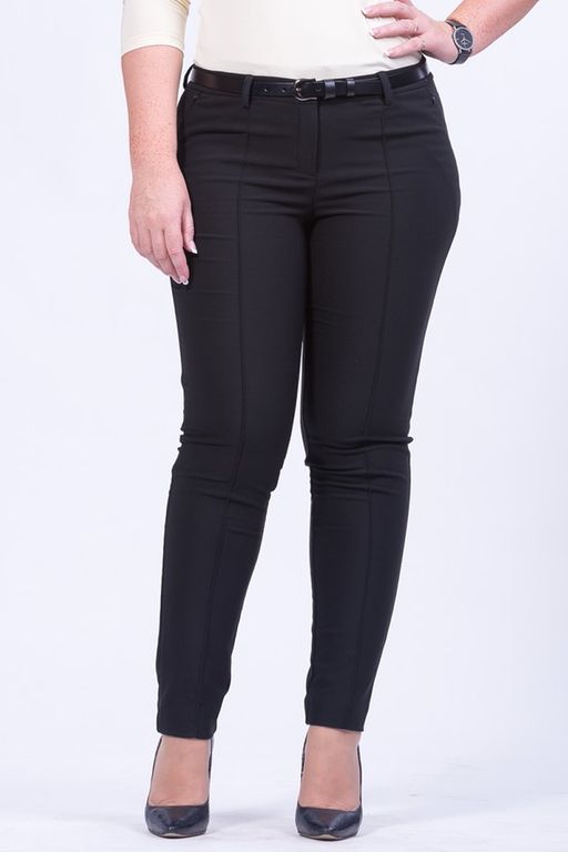 Брюки прилегающего силуэта с притачным поясом. На передних половинках отрезной карман с потайной молнией.