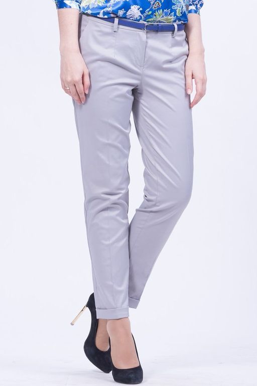 Брюки прилегающего силуэта. Передние части брюк с боковыми карманами с отрезным бочком, с гульфиком. Застежка на молнию и крючок. Задние части с двумя выточками. Верх на притачном поясе с пятью шлевками. По низу брюк манжеты.
