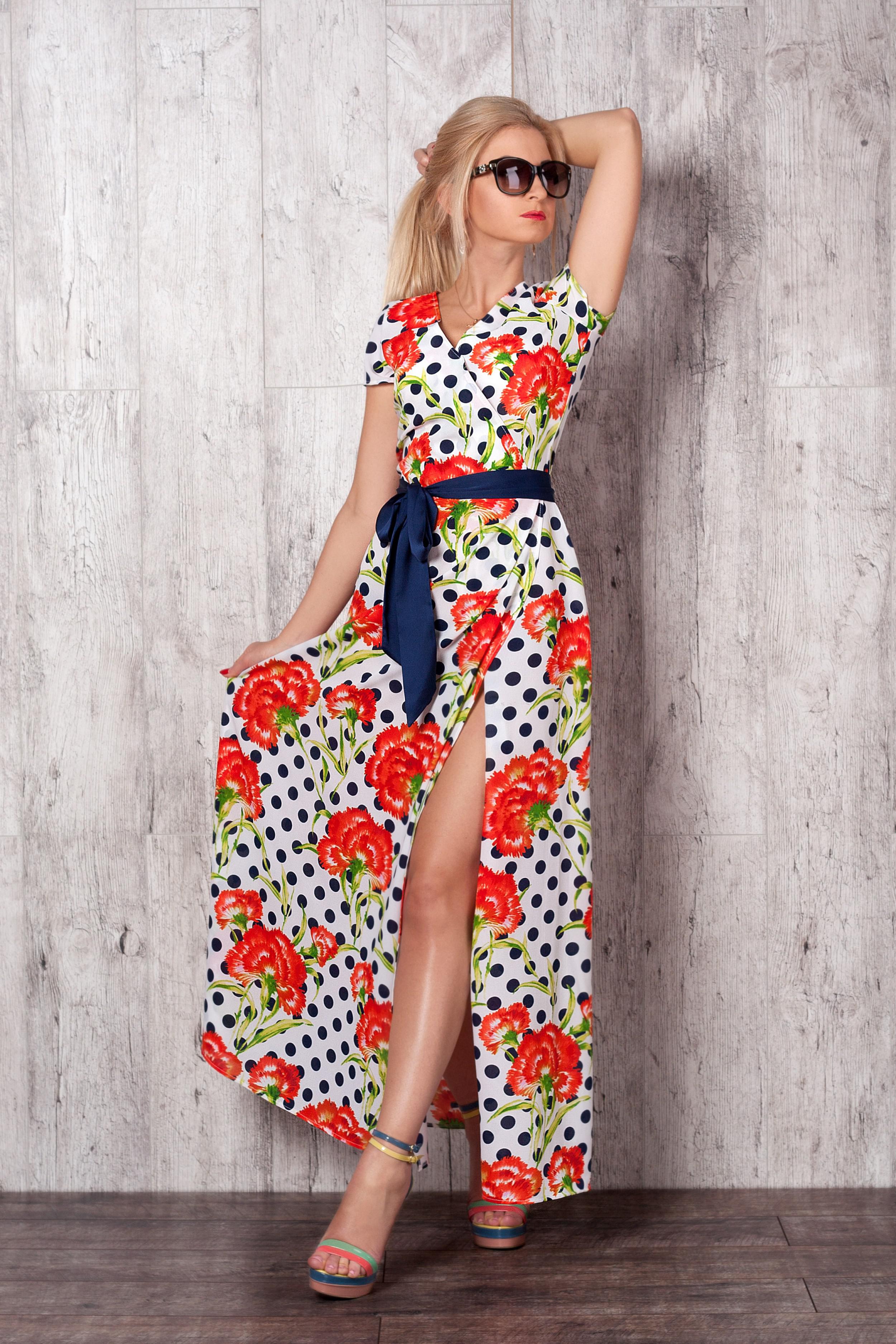 Элегантное платье принтованое в горох с цветами. Изделие классического кроя на запах, имеет пояс-завязку на линии талии. Платье изготовлено из креп-шифона.