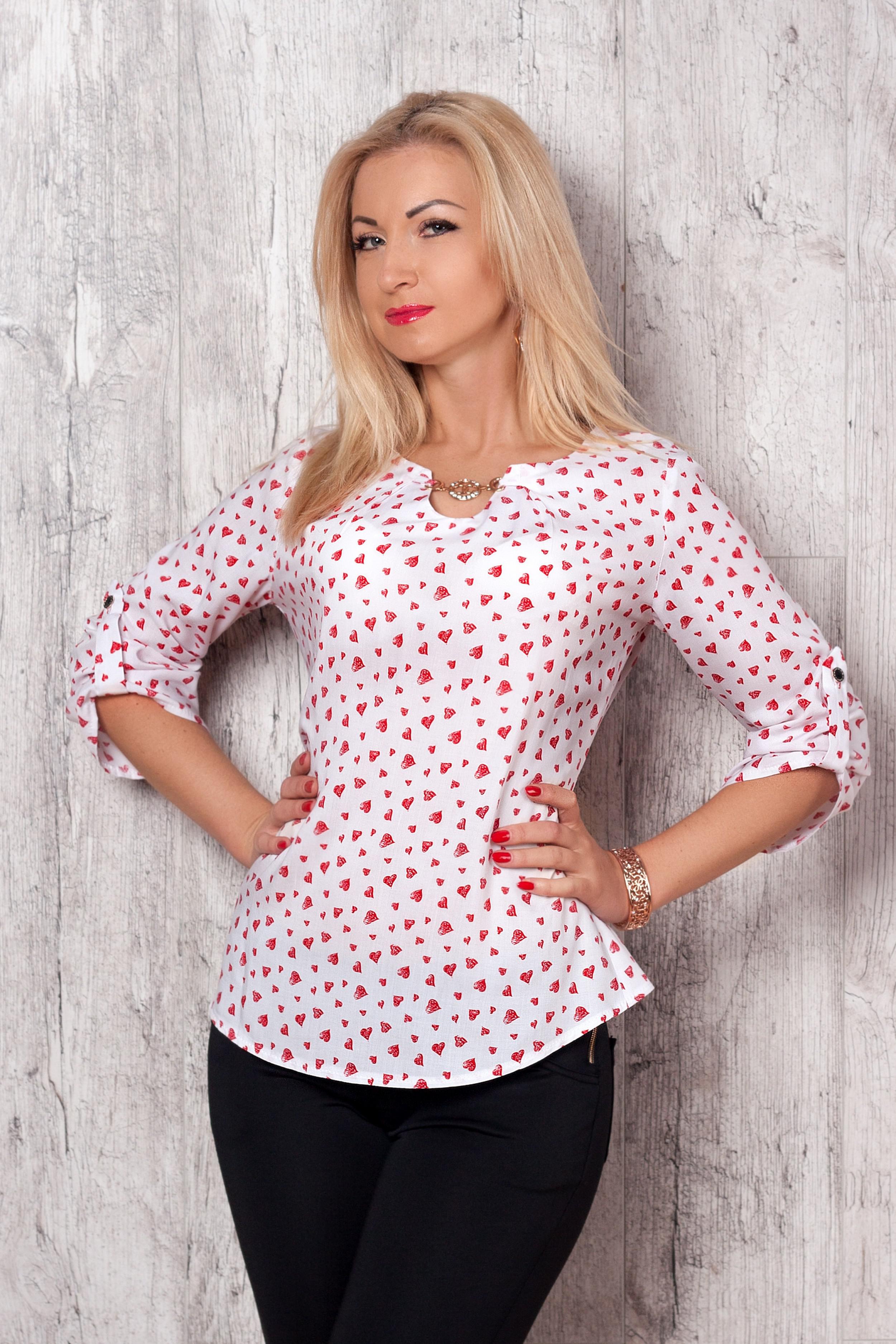 Блуза выполнена из гладкого текстиля с принтом в сердечки. Модель прямого кроя, с круглым вырезом. Рукав рубашки может быть подвернут на высоту выше локтя: для этого он имеет пуговицу и хлястик фиксации.