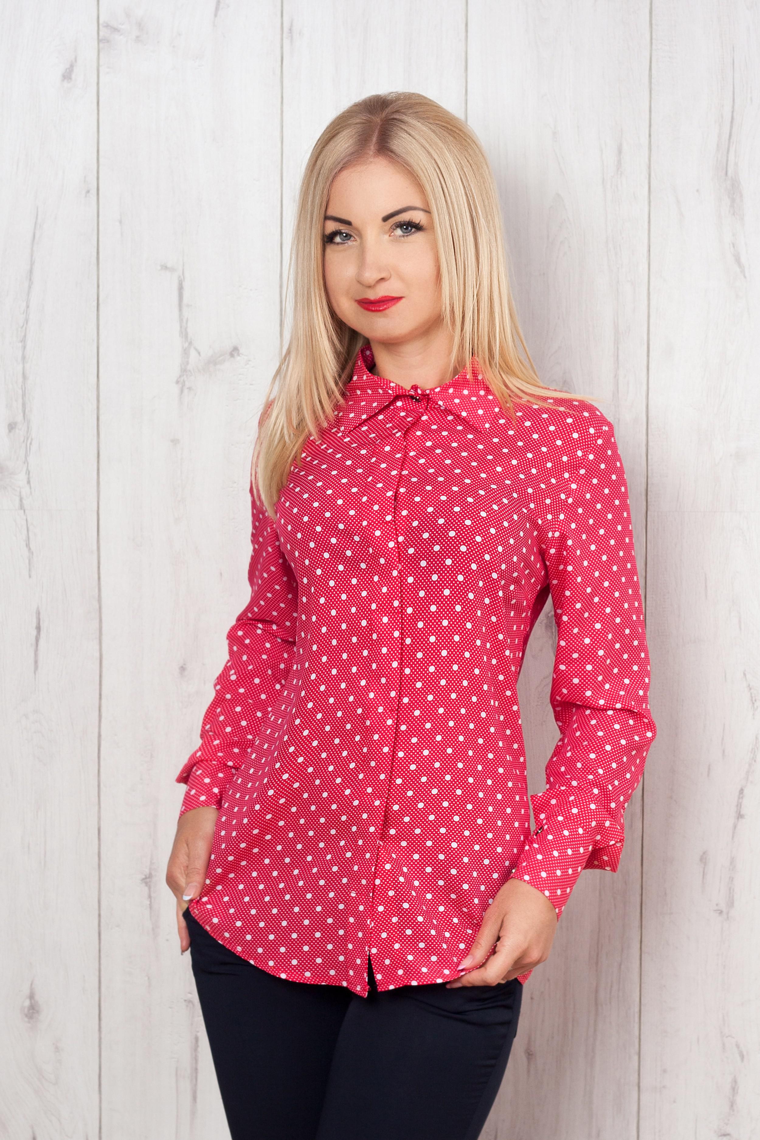 Рубашка женская, классического, приталенного кроя, с выточками на груди. Воротник отложной, рукав втачной, полной длины с манжетом на пуговице. Материал - тонкий, шелковистый, очень приятный на ощупь, принтованый в горошек.
