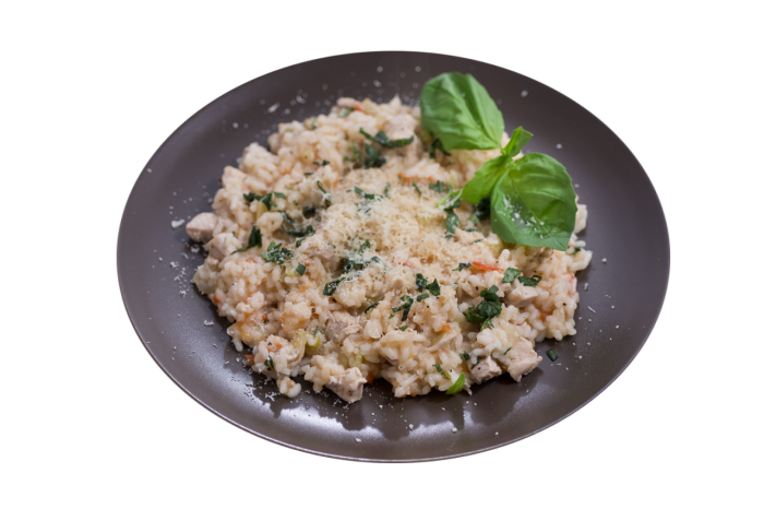 За 5 минут до готовности ризотто добавить нарезанные помидоры, тимьян, перец, соль.