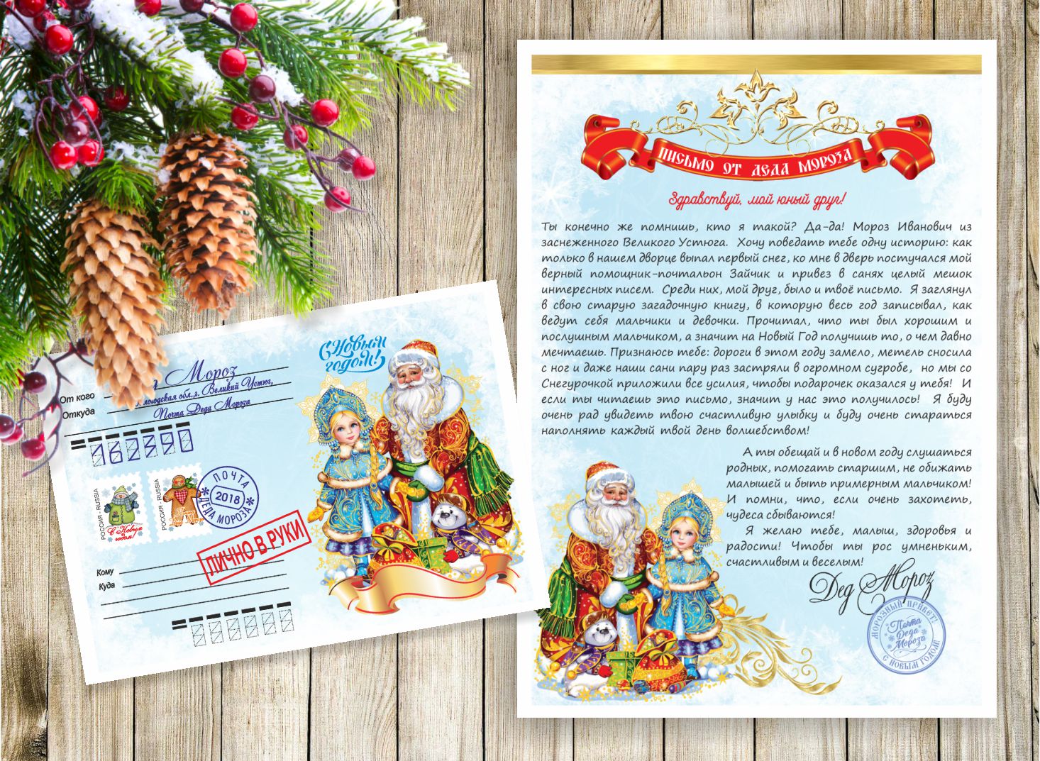 Письмо форматом А4. Конверт формата А5 заклеен и опечатан сзади сургучной печатью Деда Мороза. Лицевая сторона конверта оформлена настоящими печатями и почтовыми марками. Написан адресат и его адрес. (адрес по желанию)