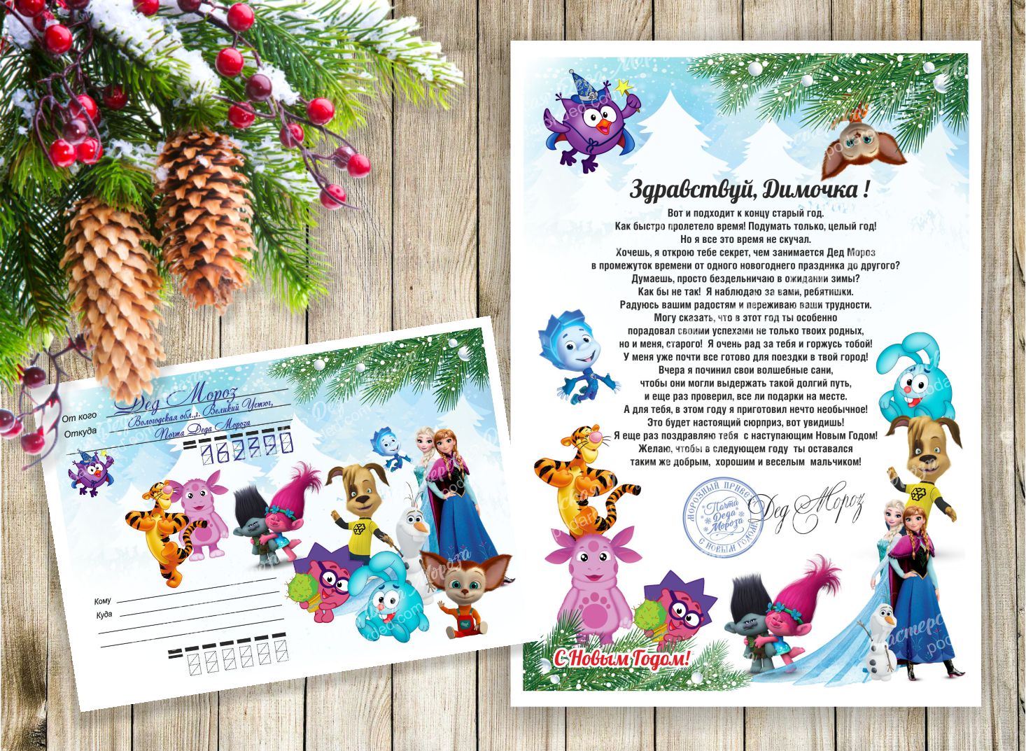 Письмо форматом А4. Конверт формата А5 заклеен и опечатан сзади сургучной печатью Деда Мороза. Лицевая сторона конверта оформлена настоящими печатями и почтовыми марками. Написан адресат и его адрес. (адрес по желанию)