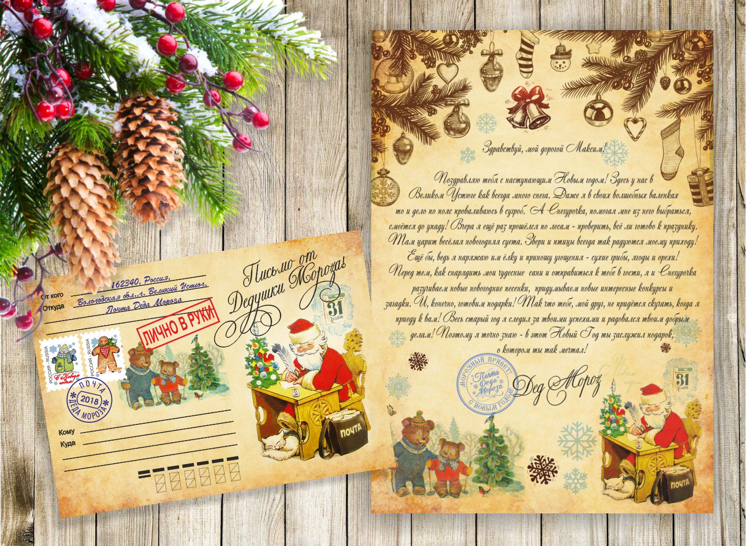 Письмо форматом А4. Конверт формата А5 заклеен и опечатан сзади сургучной печатью Деда Мороза. Лицевая сторона конверта оформлена настоящими печатями и почтовыми марками. Написан адресат и его адрес. (адрес по желанию)