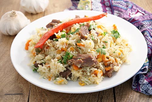 1,5 мультистакана* риса басмати экстрадлинного «Ярмарка», 3 мультистакана воды, 300 г говядины (лопатка), 300 г моркови, 2 луковицы, головка чеснока, 1 перец чили, 70 г растительного масла, щепотка зиры, соль — по вкусу.